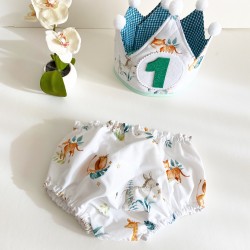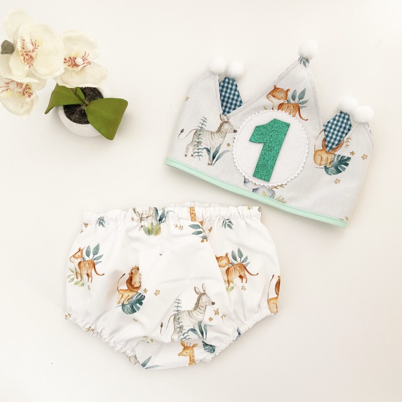 Conjunto con corona reversible: diseñada para usarse por ambos lados, incluye 3 números intercambiables. Combinamos telas infantiles con estampado vichy en el interior, teniendo siempre en cuenta la gama de colores.