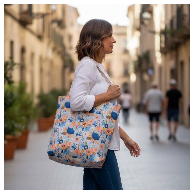 Bolso totebag acolchado confeccionado a mano en tejido de Algodon 100% y forrado en su interior con un bolsillo para guardar el movil, monedero y llaves.