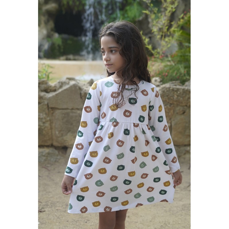 Vestido de manga corta, con frunce en la cintura y cuello redondo.